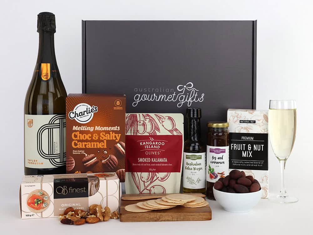 Celebrate any occasion in style with the elegant Taylor Ferguson Sparkling Prosecco NV — a crisp, refreshing wine that pairs beautifully with our curated selection of gourmet Australian delights. Inside you’ll find artisan favourites including Charlie’s Mini Melting Moments, Kangaroo Island Smoked Olives, Elite Fruit & Nut Mix, Fig & Cinnamon Jam, OB Finest Crackers, and Extra Virgin Olive Oil. A beautifully balanced gift of bubbles, savoury snacks, and sweet treats — perfect for clients, friends, and family alike.